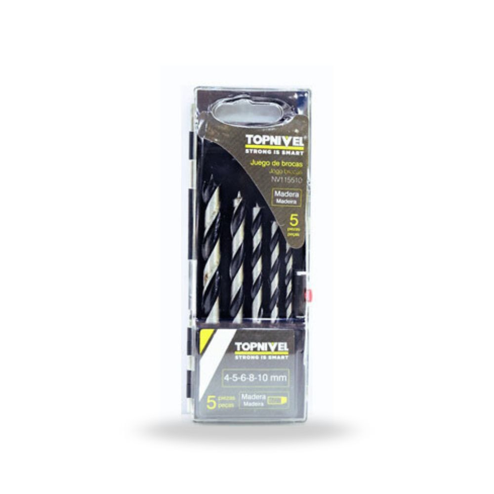 Juego de 5 brocas para madera de la marca Nivel, diseñado para perforaciones limpias y precisas. Incluye medidas de 4, 5, 6, 8 y 10 mm, ideal para trabajos de bricolaje y carpintería en madera blanda y dura. Calidad y durabilidad en cada uso.