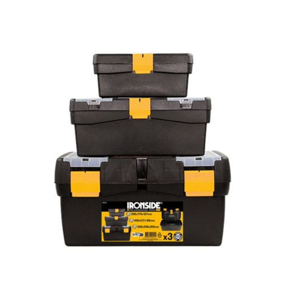 Juego de 3 cajas de herramientas Ironside de 4, 10 y 23 litros, fabricadas en polipropileno 100% reciclado. Almacenaje resistente, práctico y sostenible para taller o garaje.