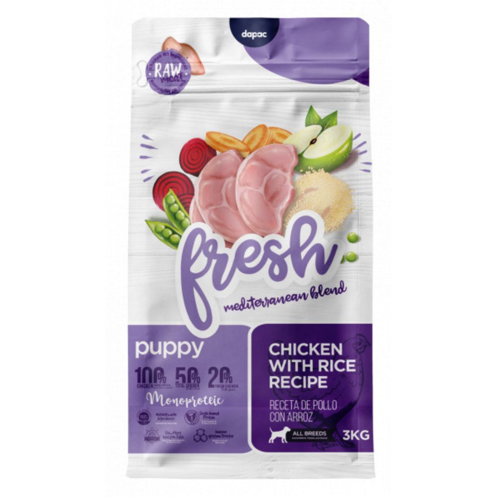 Pienso natural para cachorros de todas las razas. 80% proteína animal, 50% pollo total y 20% fresco. Rico en prebióticos y antioxidantes.Croqueta de 10 mm.