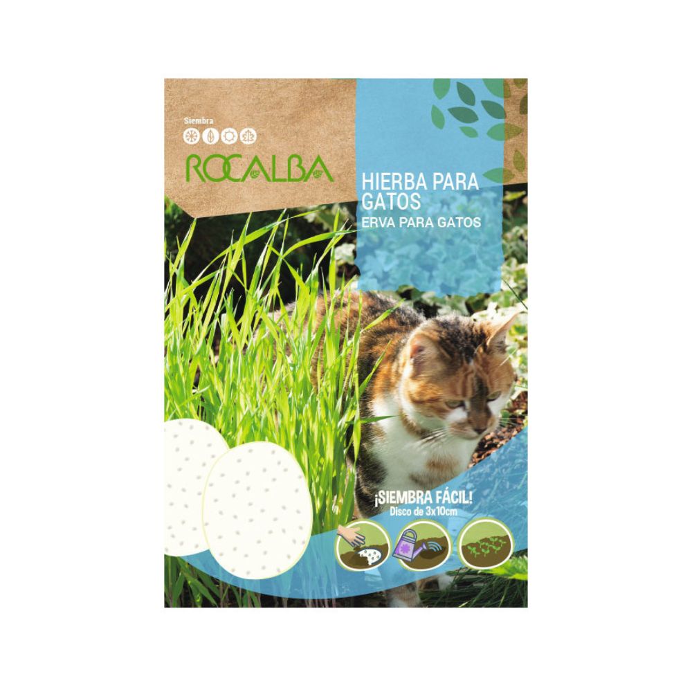 Hierba para gatos en disco, fácil de sembrar en interior o exterior durante todoel año. Planta natural que ayuda a regular la digestión de losfelinos.
