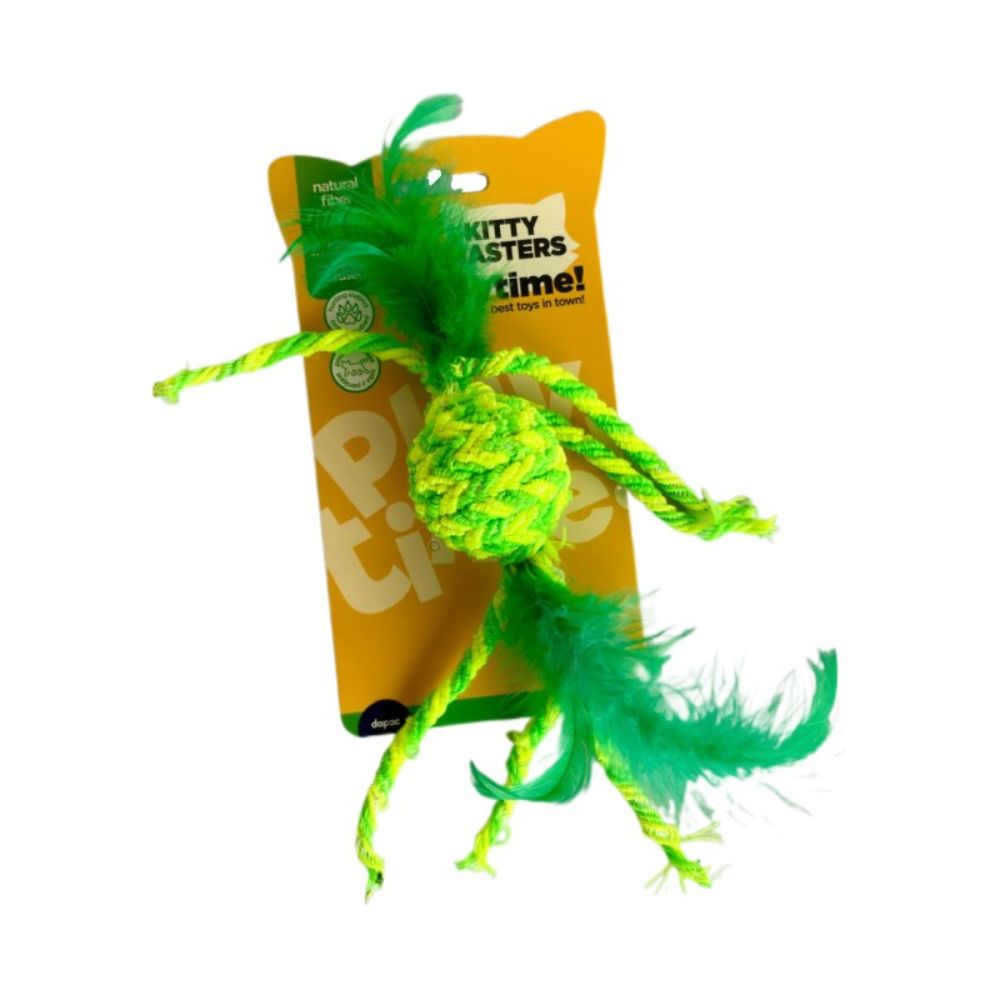 Bola de sisal para gatos con doble pluma que estimula el juego y el ejercicio. Textura resistente y atractiva para cazar, atrapar y jugar de forma segura.