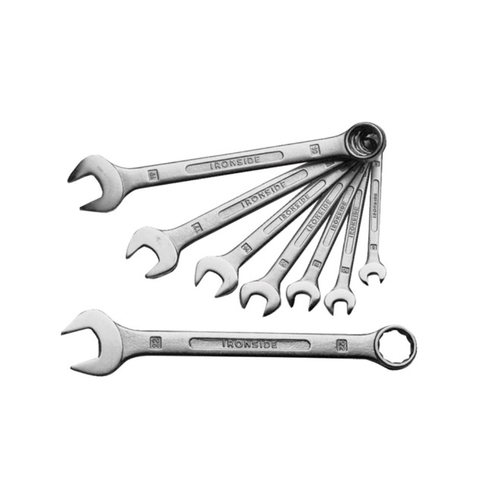 Juego de llaves combinadas Ironside de 8 piezas con medidas de 8 a 22 mm,resistente y versátil, ideal para mecánica, mantenimiento y bricolaje profesional.