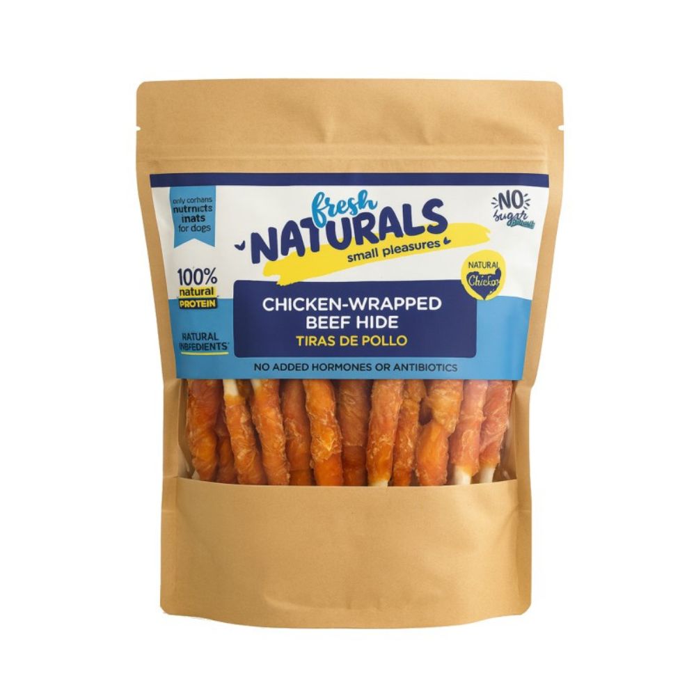 Tiras de pollo sobre piel de vacuno para perro, ricas en proteína (60%) y sin azúcar añadido. Snack crujiente y duradero que favorece la masticación y la salud dental.