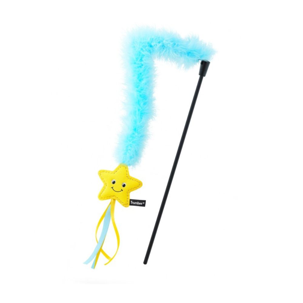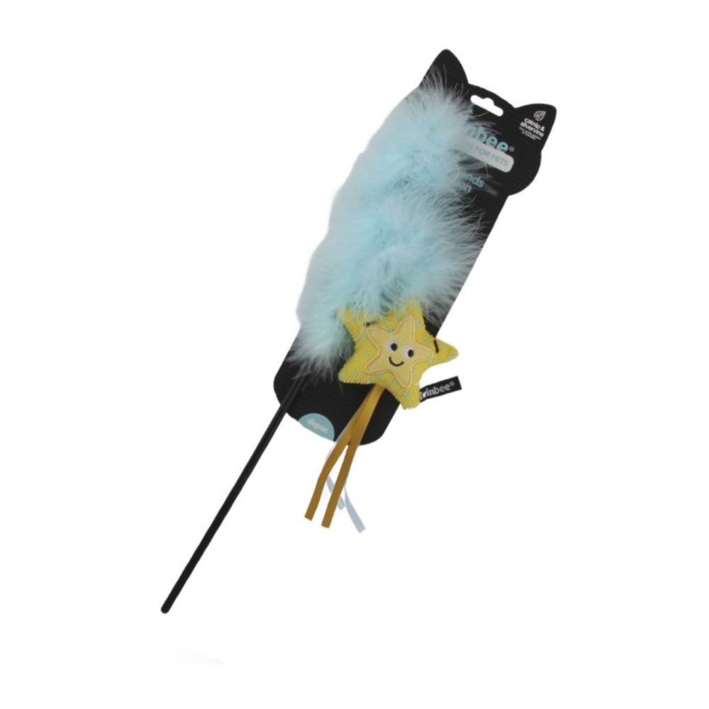 Caña interactiva para gatos con pluma turquesa y estrella de peluche concintas, infusionada con catnip y silvervine. Estimula la caza y refuerza el vínculo. Varilla 42,7 cm, estrella 9 × 2,5 cm.